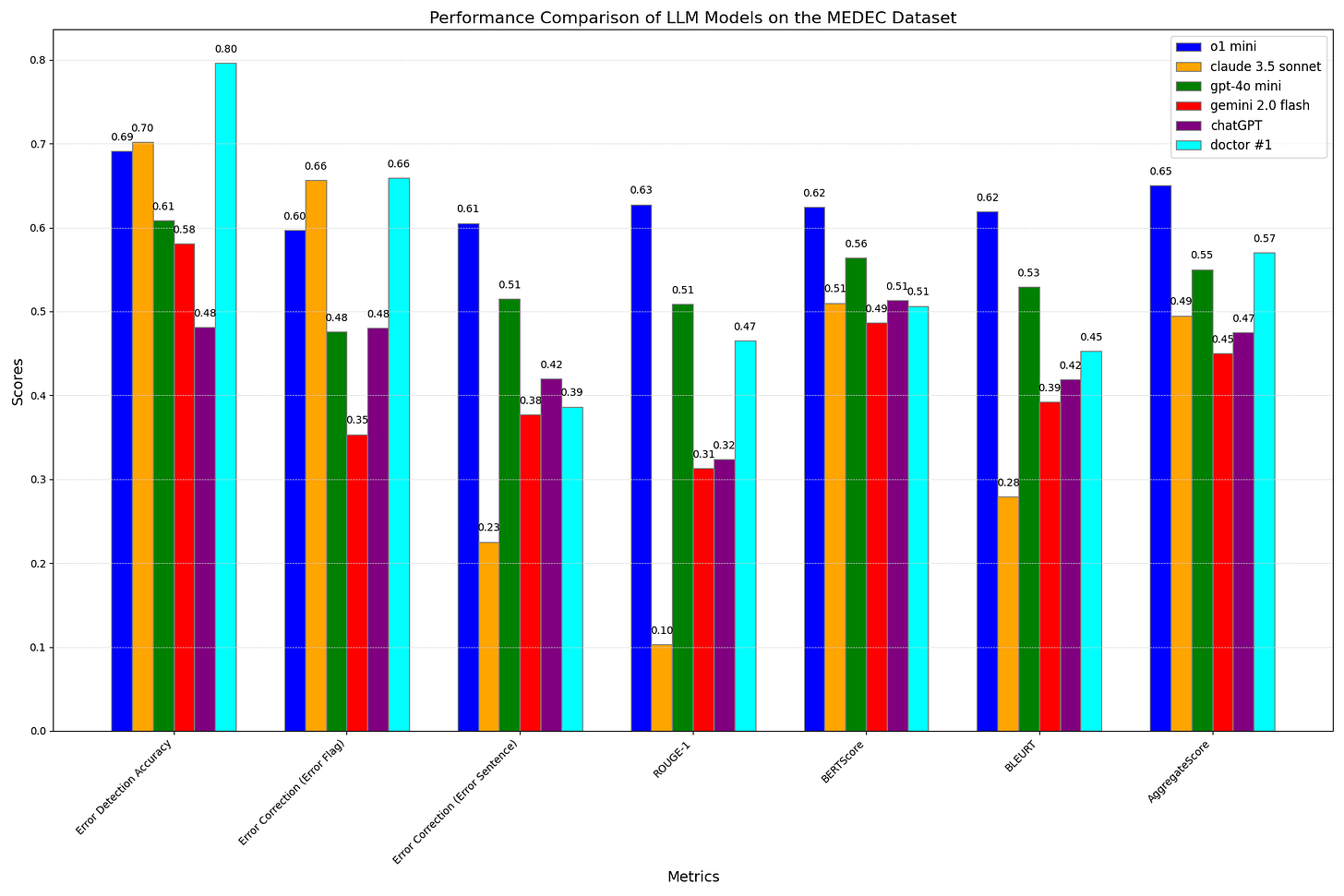 Of course, no system is perfect, and MEDEC is no exception. While recent LLMs perform well in error detection and correction, they are still outperformed by medical doctors in these tasks. This highlights the need for continuous improvement and collaboration between AI and human expertise.